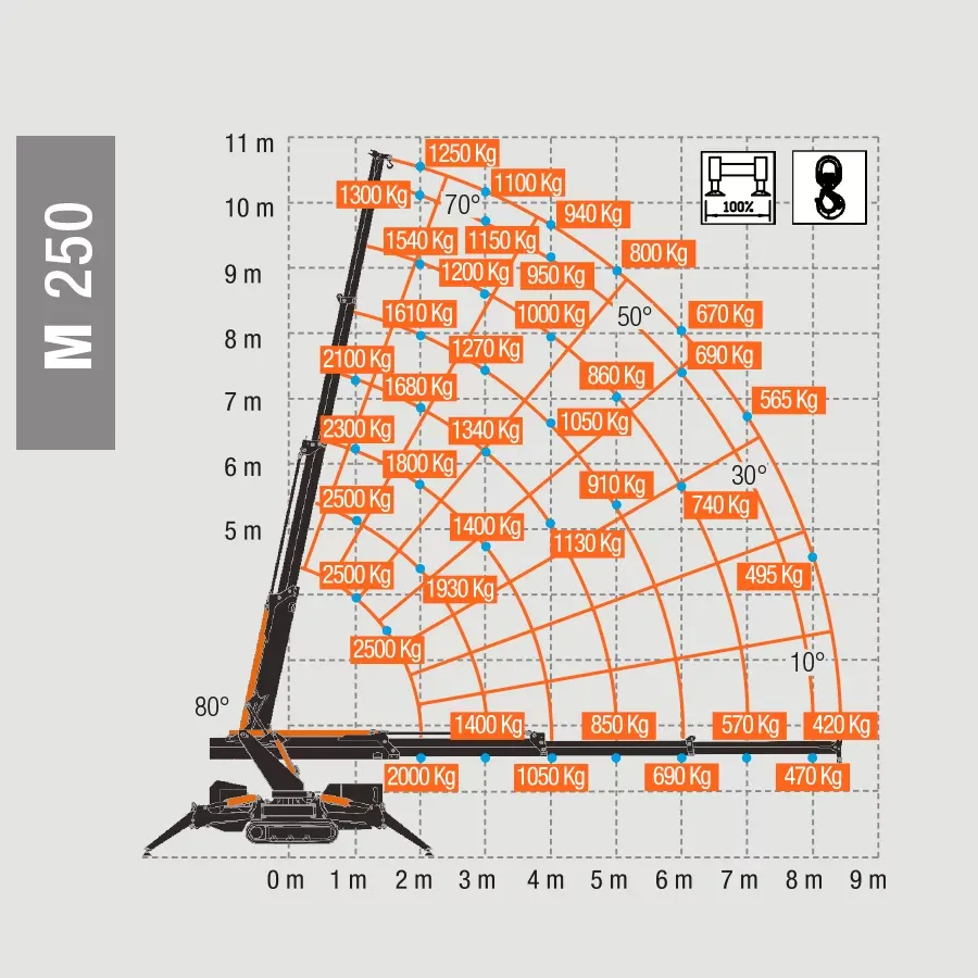 Maximale hijshoogte: 16 mMaximale reikwijdte: 12 mEigen gewicht: 2.700 kgMinimale breedte: 78 cm